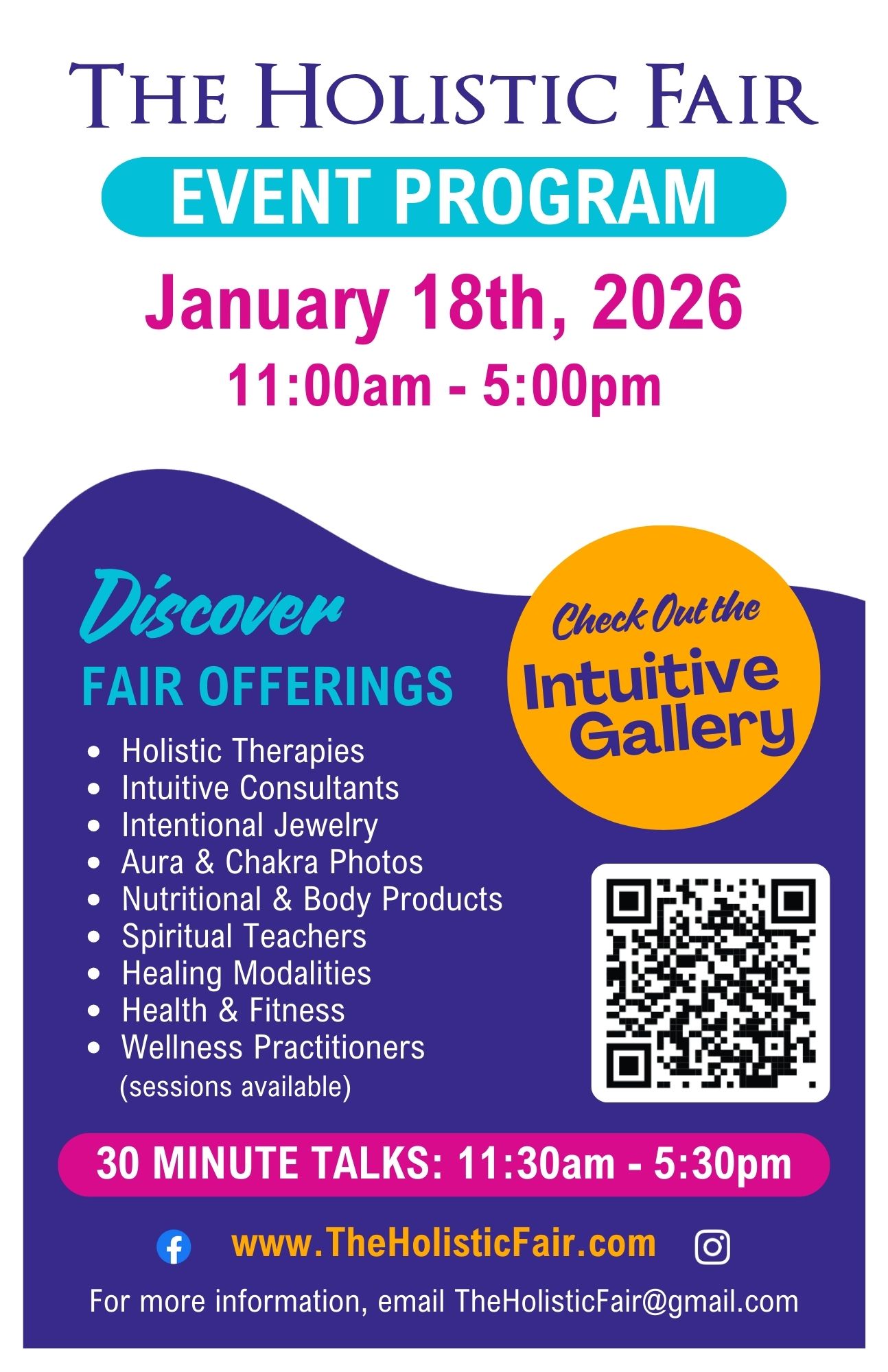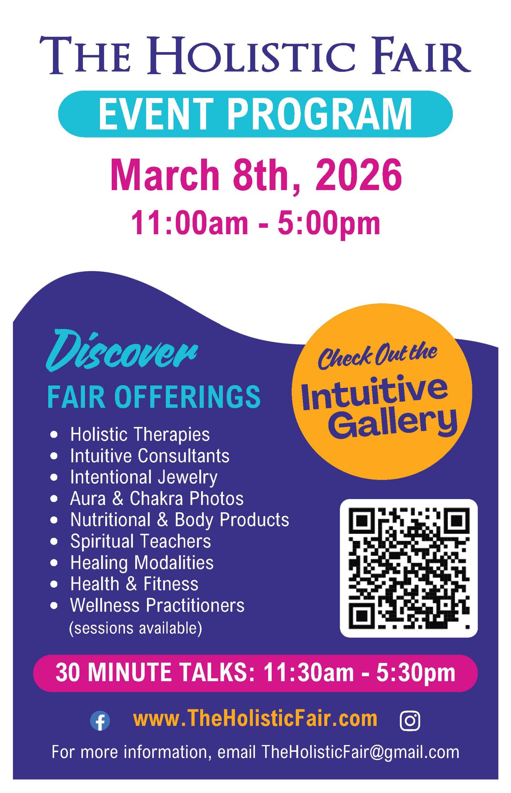 The Holistic Fair features over 50 facilitators of Complementary and Alternative Modalities, Nutritional Consultations and Products along with Energy Medicine Practitioners and our Intuitive Gallery.